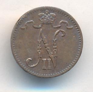 Лицевая сторона — вензель Александра II, оборотная — номинал (1 PENNIA) и дата. Нормативный вес — 1,28 грамма, гурт гладкий.