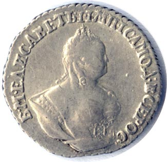 Лицевая сторона — портрет и надпись «Б М Елисаветъ I IMP I САМОД ВСЕРОС», оборотная — обозначение номинала (гривенникъ) и дата. Проба — 750 (с 1746 года - 802), нормативный вес — 2,59 грамма (с 1755 года — 2,42). Гурт — шнур.