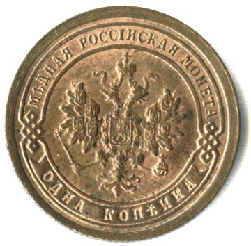Лицевая сторона — двуглавый орел, надпись МЕДНАЯ РОССIЙСКАЯ МОНЕТА и обозначение номинала (одна копейка); оборотная — обозначение номинала (1 копейка) в бусовом ободке и дата. Нормативный вес — 3,28 грамма, гурт рубчатый.