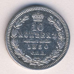 Лицевая сторона — новый гербовый орел с поднятыми крыльями, оборотная —обозначение номинала (10 копеекъ), окруженное венком из лавровой и дубовой ветвей и дата. Проба — 868, нормативный вес — 2,07 грамма.