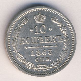 Лицевая сторона — гербовый орел, оборотная —обозначение номинала (10 копеекъ), окруженное венком из лавровой и дубовой ветвей и дата.