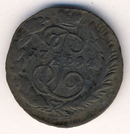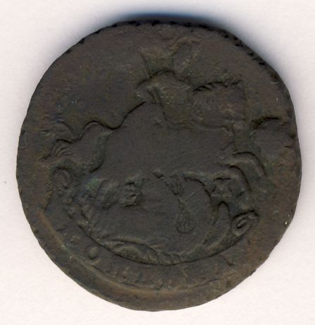 Лицевая сторона — Георгий Победоносец и обозначение номинала (копейка) в картуше, оборотная — вензель Екатерины II и дата. Нормативный вес — 10,24 грамма, гурт — сетка, или узор, или шнур.
