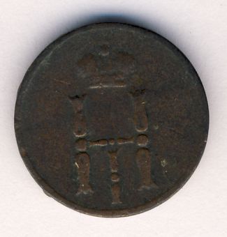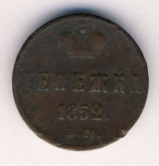Лицевая сторона — вензель Николая I, оборотная — обозначение номинала (денежка) и дата. Нормативный вес — 2,56 грамма, гурт гладкий.