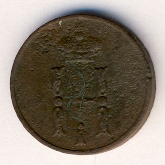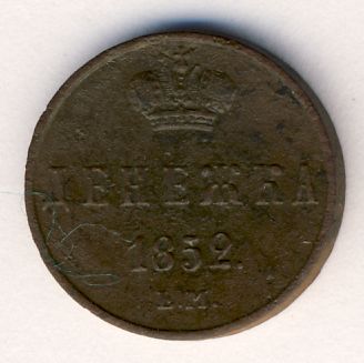 Лицевая сторона — вензель Николая I, оборотная — обозначение номинала (денежка) и дата. Нормативный вес — 2,56 грамма, гурт гладкий.