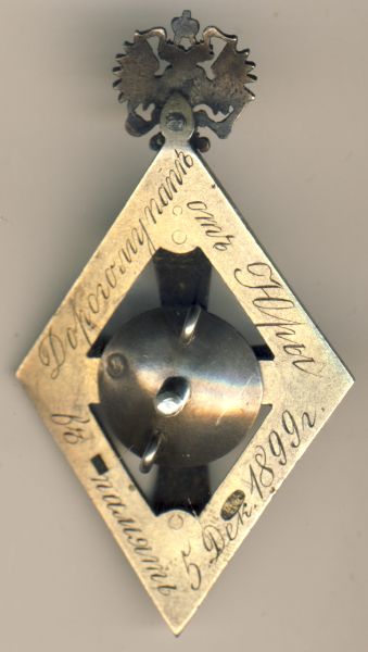 Особенности: Гравировка. Клейма: на оборотной стороне знака – пробирное "84", женская голова влево, "ИЛ"? в овальном щитке, мастера "КК"