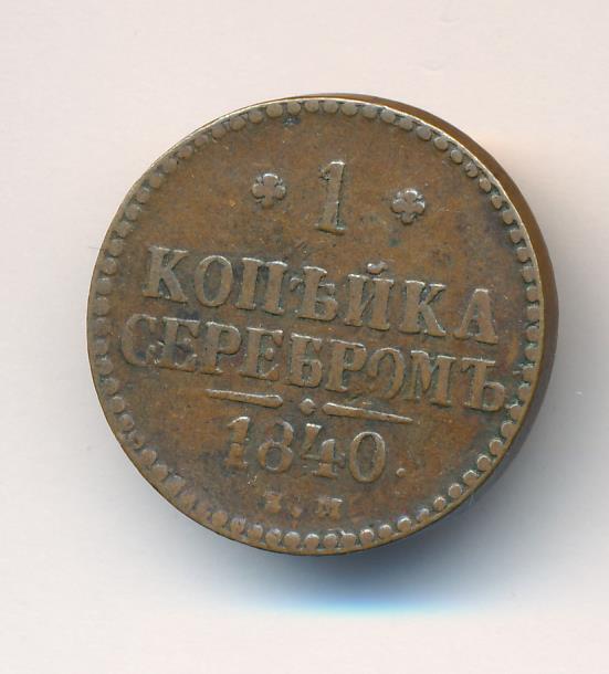 На новых монетах равенство серебряному курсу указано прямо в номинале: «1 КОПЕЙКА СЕРЕБРОМ». Указ об их выпуске следует 6 сентября 1840 года («О новой медной монете на серебро 16-рублевого в пуде достоинства»). Массовая чеканка началось за год до этого на Екатеринбургском (знак ЕМ) и Сузунском (знак СМ) дворах. В качестве временной меры в 1840-1843 годах к ним подключается Ижорский завод (знак СПМ). С 1844 года после «значительного скопления медной монеты в народном обращении» в Екатеринбурге производство прекращается, а в Сузуне сокращается.