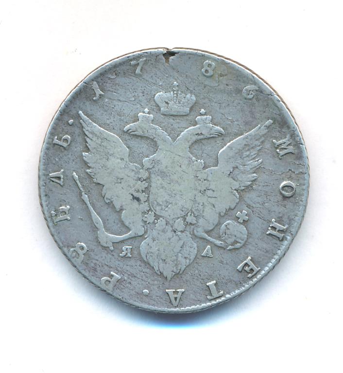 Выделяют два типа - «шея длиннее» и «шея короче». Лицевая сторона — портрет императрицы и надпись «Б М ЕКАТЕРИНА II IМП И САМОД ВСЕРОСС», оборотная — двуглавый орел и надпись «МОНЕТА РУБЛЬ» и дата. Проба — 750, нормативный вес — 24 грамма, гурт — шнур.