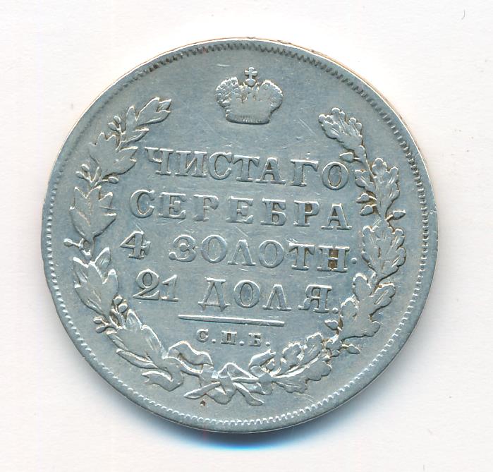 Лицевая сторона - «масонский орел», надпись «МОНЕТА РУБЛЬ» и дата, оборотная - окруженная венком из лавровой и дубовой ветвей надпись «ЧИСТАГО СЕРЕБРА 4 ЗОЛОТН 21 ДОЛЯ». Проба — 868, нормативный вес — 20,73 грамма.
