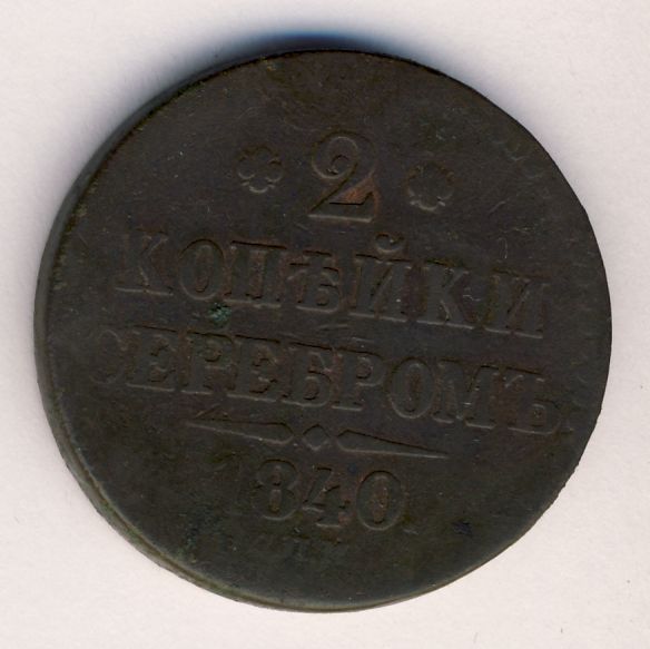 На новых монетах равенство серебряному курсу указано прямо в номинале: «2 КОПЕЙКИ СЕРЕБРОМ». Указ об их выпуске следует 6 сентября 1840 года («О новой медной монете на серебро 16-рублевого в пуде достоинства»). Массовая чеканка началось за год до этого на Екатеринбургском (знак ЕМ) и Сузунском (знак СМ) дворах. В качестве временной меры в 1840-1843 годах к ним подключается Ижорский завод (знак СПМ). С 1844 года после «значительного скопления медной монеты в народном обращении» в Екатеринбурге производство прекращается, а в Сузуне сокращается. Варшавский двор (знак MW), получив разрешение на выпуск общегосударственной монеты, успел отчеканить ее лишь в небольшом количестве в 1848 году.
