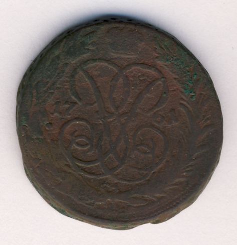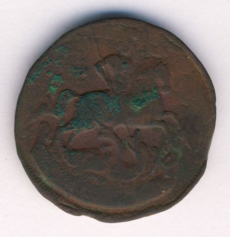 Производство ведется на московском Красном, Екатеринбургском и Сестрорецком дворах. Лицевая сторона — Георгий Победоносец и обозначение номинала (копейка) в картуше, оборотная — сложный симметричный вензель Елизаветы Петровны и дата. Нормативный вес — 10,24 грамма, гурт — сетка.