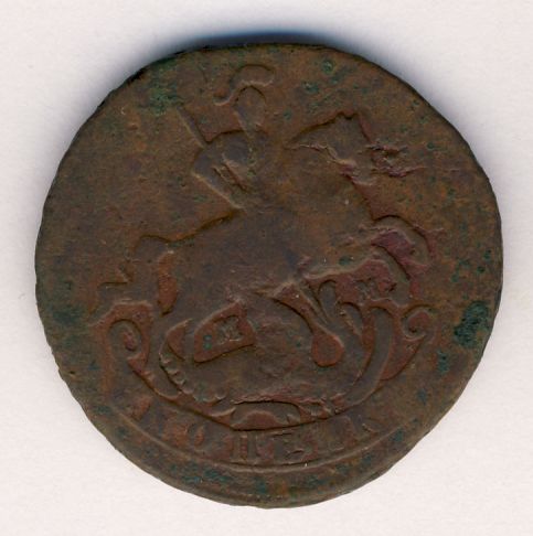 Лицевая сторона — Георгий Победоносец и обозначение номинала (копейка) в картуше, оборотная — вензель Екатерины II и дата. Нормативный вес — 10,24 грамма, гурт — сетка, или узор, или шнур.