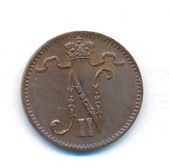 Лицевая сторона — вензель Александра II, оборотная — номинал (1 PENNIA) и дата. Нормативный вес — 1,28 грамма, гурт гладкий.