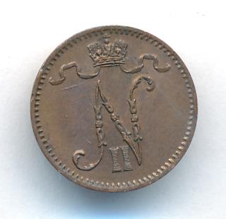 Лицевая сторона — вензель Александра II, оборотная — номинал (1 PENNIA) и дата. Нормативный вес — 1,28 грамма, гурт гладкий.