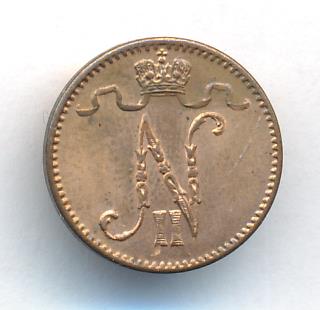 Лицевая сторона — вензель Александра II, оборотная — номинал (1 PENNIA) и дата. Нормативный вес — 1,28 грамма, гурт гладкий.