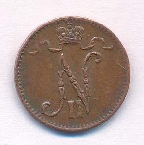 Лицевая сторона — вензель Александра II, оборотная — номинал (1 PENNIA) и дата. Нормативный вес — 1,28 грамма, гурт гладкий.
