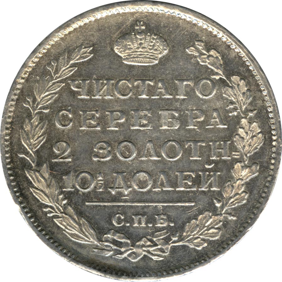 Лицевая сторона - двуглавый орел, дата и надпись «МОНЕТА РУБЛЬ», оборотная — окруженная венком из лавровой и дубовой ветвей надпись «ЧИСТАГО СЕРЕБРА 2 ЗОЛОТН 10 ДОЛЕЙ». Проба — 868, нормативный вес — 10,37 грамма.