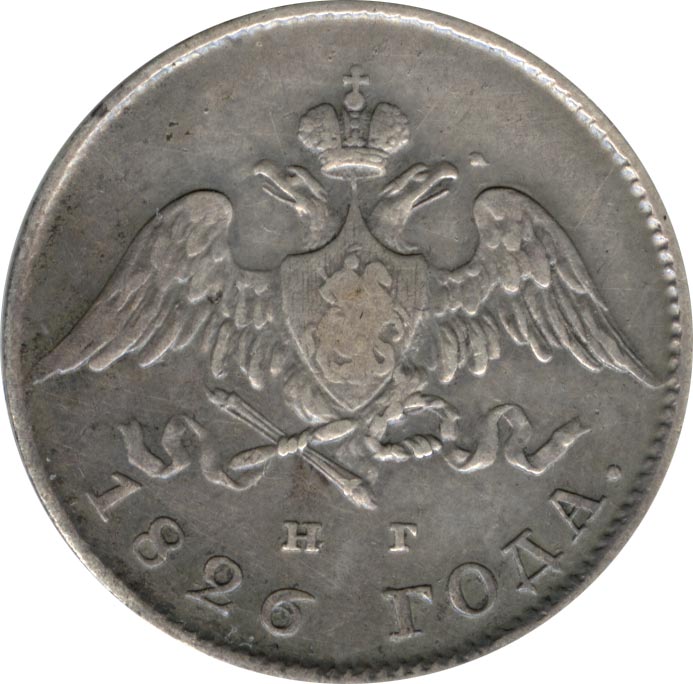 Указом от 1 июля 1826 года Николай I сохраняет вес и пробу золотых и серебряных монет, но приводит к единообразию их внешний вид. На серебряные монеты, вслед за золотыми, помещается новый герб - так называемый «масонский» орел с опущенными крыльями, на груди которого московский герб, в лапах факелы, лавровый венок, ликторский пучок и лента, без корон на головах. См. Статью «Масонский орел» на сайте «Конрос».