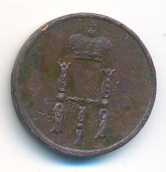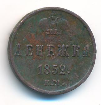 Лицевая сторона — вензель Николая I, оборотная — обозначение номинала (денежка) и дата. Нормативный вес — 2,56 грамма, гурт гладкий.