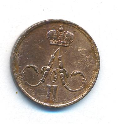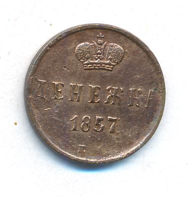Лицевая сторона — вензель Николая I, оборотная — обозначение номинала (денежка) и дата. Нормативный вес — 2,56 грамма, гурт гладкий.