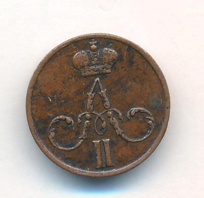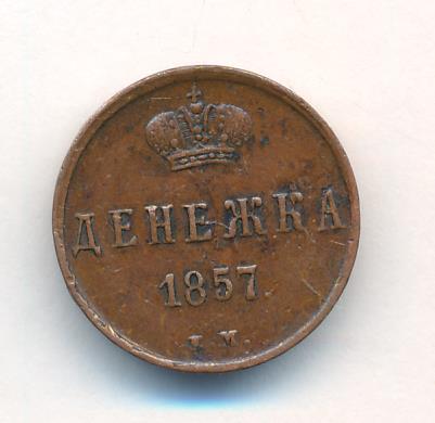 Лицевая сторона — вензель Николая I, оборотная — обозначение номинала (денежка) и дата. Нормативный вес — 2,56 грамма, гурт гладкий.
