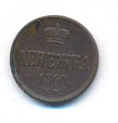 Лицевая сторона — вензель Николая I, оборотная — обозначение номинала (денежка) и дата. Нормативный вес — 2,56 грамма, гурт гладкий.