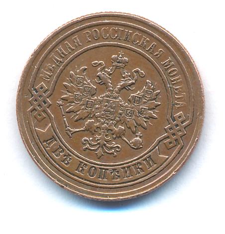 Лицевая сторона — двуглавый орел, надпись МЕДНАЯ РОССIЙСКАЯ МОНЕТА и обозначение номинала (две копейки); оборотная — обозначение номинала (2 копейки) в бусовом ободке и дата. Нормативный вес — 6,55 грамма, гурт рубчатый.