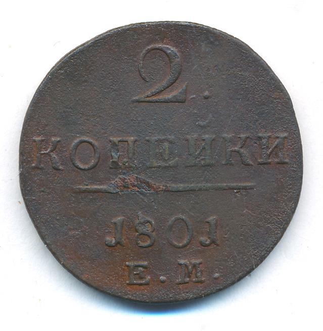 Лицевая сторона — вензель Павла I под короной, оборотная — номинал (2 копейки) и дата. Нормативный вес — 20,48 грамма, гурт — шнур.