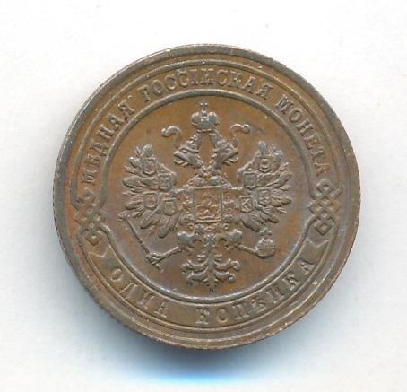 Лицевая сторона — двуглавый орел, надпись МЕДНАЯ РОССIЙСКАЯ МОНЕТА и обозначение номинала (одна копейка); оборотная — обозначение номинала (1 копейка) в бусовом ободке и дата. Нормативный вес — 3,28 грамма, гурт рубчатый.