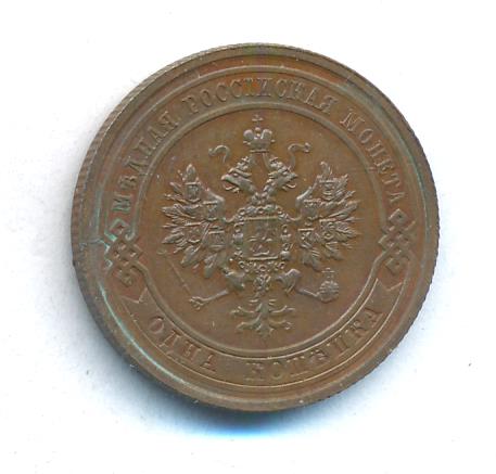 Лицевая сторона — двуглавый орел, надпись МЕДНАЯ РОССIЙСКАЯ МОНЕТА и обозначение номинала (одна копейка); оборотная — обозначение номинала (1 копейка) в бусовом ободке и дата. Нормативный вес — 3,28 грамма, гурт рубчатый.