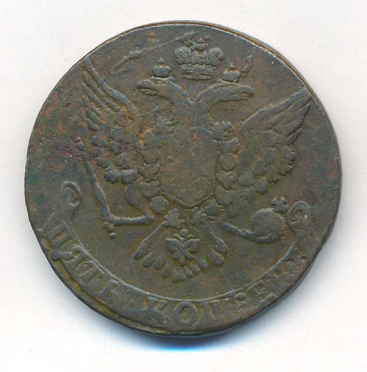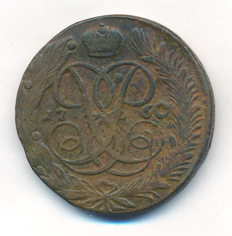 Лицевая сторона — двуглавый орел и обозначение номинала (пять копеекъ), оборотная — сложный симметричный вензель Елизаветы Петровны и дата. Нормативный вес — 51,19 грамма, гурт — сетка.