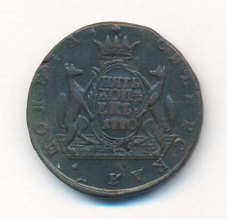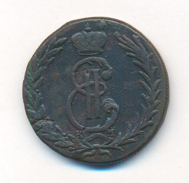 Лицевая сторона - два соболя поддерживают щит с обозначением номинала (пять копеекъ) под короной, надпись «СИБИРСКАЯ МОНЕТА». Оборотная — вензель Екатерины II в венке из пальмовой и лавровой ветвей. Гурт — надпись «колыванская медь» или шнур. Вес — 32,76 грамма.