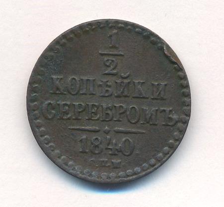 На новых монетах равенство серебряному курсу указано прямо в номинале: «1/2 КОПЕЙКИ СЕРЕБРОМ». Указ об их выпуске следует 6 сентября 1840 года («О новой медной монете на серебро 16-рублевого в пуде достоинства»). Массовая чеканка началось за год до этого на Екатеринбургском (знак ЕМ) и Сузунском (знак СМ) дворах. В качестве временной меры в 1840-1843 годах к ним подключается Ижорский завод (знак СПМ). С 1844 года после «значительного скопления медной монеты в народном обращении» в Екатеринбурге производство прекращается, а в Сузуне сокращается. Варшавский двор (знак MW), получив разрешение на выпуск общегосударственной монеты, успел отчеканить ее лишь в небольшом количестве в 1848 году.