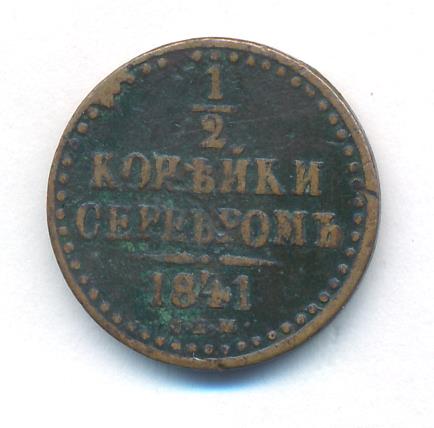 На новых монетах равенство серебряному курсу указано прямо в номинале: «1/2 КОПЕЙКИ СЕРЕБРОМ». Указ об их выпуске следует 6 сентября 1840 года («О новой медной монете на серебро 16-рублевого в пуде достоинства»). Массовая чеканка началось за год до этого на Екатеринбургском (знак ЕМ) и Сузунском (знак СМ) дворах. В качестве временной меры в 1840-1843 годах к ним подключается Ижорский завод (знак СПМ). С 1844 года после «значительного скопления медной монеты в народном обращении» в Екатеринбурге производство прекращается, а в Сузуне сокращается. Варшавский двор (знак MW), получив разрешение на выпуск общегосударственной монеты, успел отчеканить ее лишь в небольшом количестве в 1848 году.