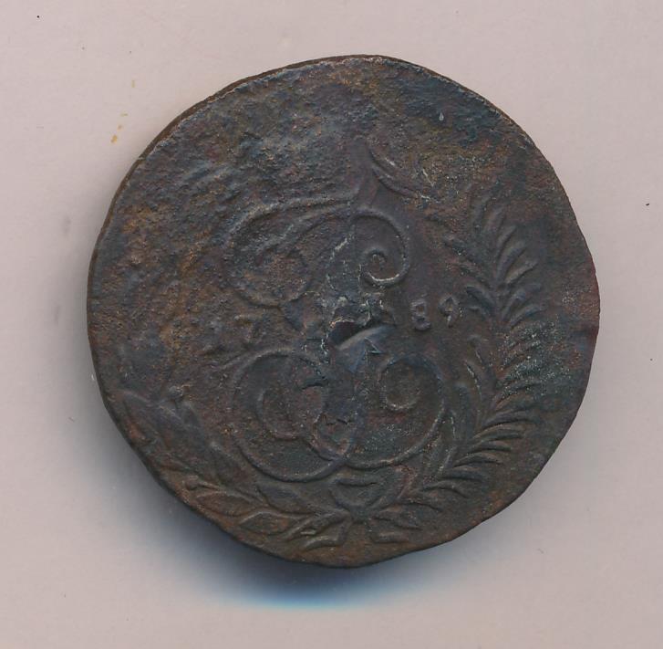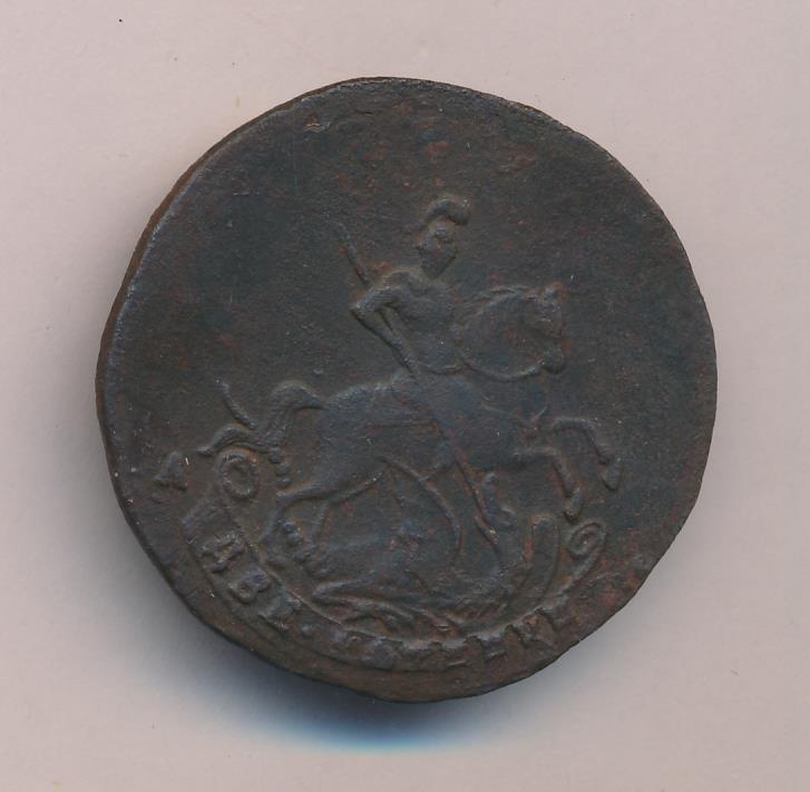 Лицевая сторона — Георгий Победоносец и обозначение номинала (две копейки) в картуше, оборотная — вензель Екатерины II и дата. Нормативный вес — 20,48 грамма, гурт — сетка или шнур.