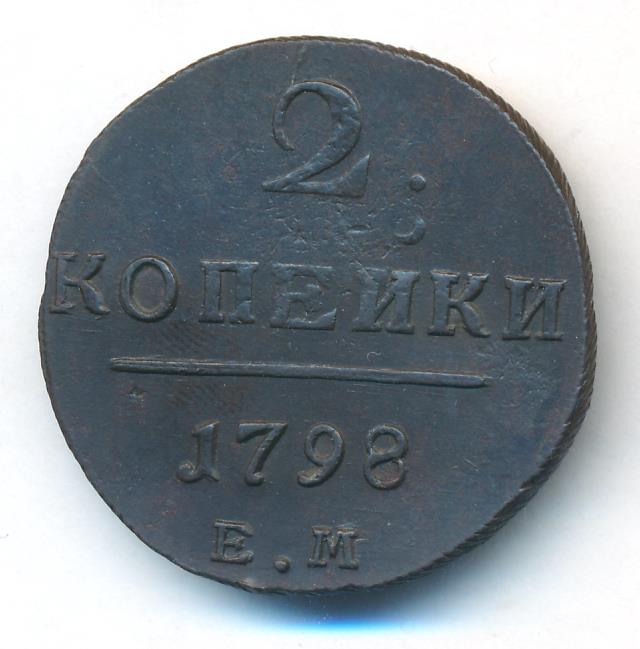 Лицевая сторона — вензель Павла I под короной, оборотная — номинал (2 копейки) и дата. Нормативный вес — 20,48 грамма, гурт — шнур.