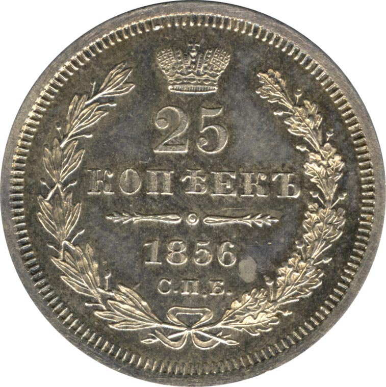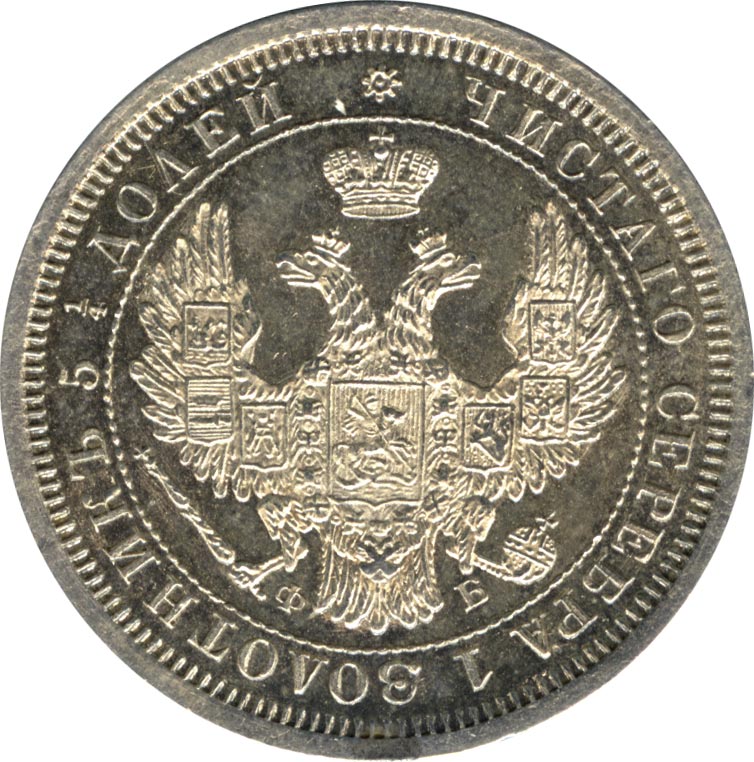 Лицевая сторона — новый гербовый орел с поднятыми крыльями и надпись «ЧИСТОГО СЕРЕБРА 1 ЗОЛОТНИКЪ 5 ДОЛЕЙ», оборотная —обозначение номинала (25 копеекъ), окруженное венком из лавровой и дубовой ветвей и дата.
