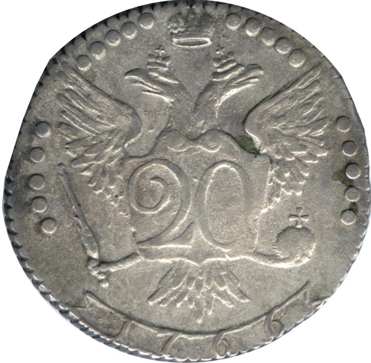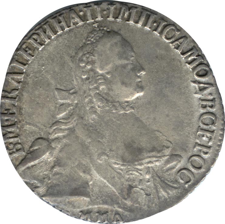 Выделяют два типа - «с шарфом на шее» и без него. Монеты 1764 года ММД со знаком гравера выполнены штемпелями полуполтин. На оборотной стороне монеты — двадцать счетных точек. Лицевая сторона — портрет императрицы и надпись «Б М ЕКАТЕРИНА II IМП I САМОД ВСЕРОС», оборотная — двуглавый орел, обозначение номинала цифрой и счетными точками и дата. Проба — 750, нормативный вес — 4,77 грамма, гурт — шнур.