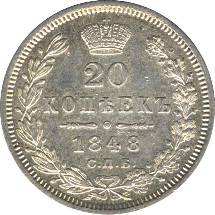 Лицевая сторона — новый гербовый орел с поднятыми крыльями, оборотная —обозначение номинала (20 копеекъ), окруженное венком из лавровой и дубовой ветвей и дата. Проба — 868, нормативный вес — 4,15 грамма.