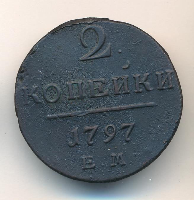 Лицевая сторона — вензель Павла I под короной, оборотная — номинал (2 копейки) и дата. Нормативный вес — 20,48 грамма, гурт — шнур.