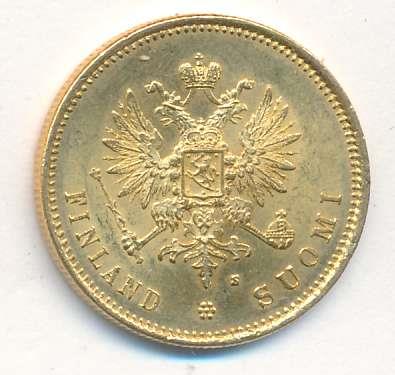 Лицевая сторона — российский двуглавый орел с гербом Великого княжества Финляндского на груди, оборотная — номинал и дата в кольцевой надписи с указанием содержания чистого золота и меди в граммах. Проба — 900, нормативный вес — 6,45 грамма, гурт ребристый.