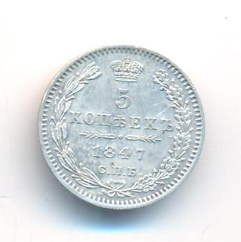 Лицевая сторона — новый гербовый орел с поднятыми крыльями, оборотная —обозначение номинала (5 копеекъ), окруженное венком из лавровой и дубовой ветвей и дата. Проба — 868, нормативный вес — 1,04 грамма.