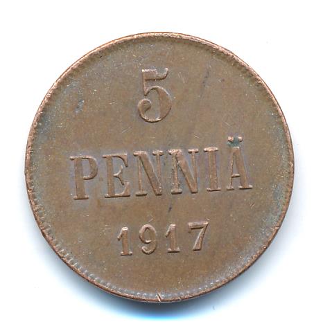 Лицевая сторона — вензель Александра II, оборотная — номинал (5 PENNIA) и дата. Нормативный вес — 6,40 грамма, гурт гладкий.