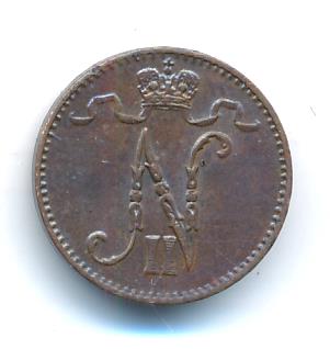 Лицевая сторона — вензель Александра II, оборотная — номинал (1 PENNIA) и дата. Нормативный вес — 1,28 грамма, гурт гладкий.