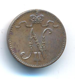 Лицевая сторона — вензель Александра II, оборотная — номинал (1 PENNIA) и дата. Нормативный вес — 1,28 грамма, гурт гладкий.