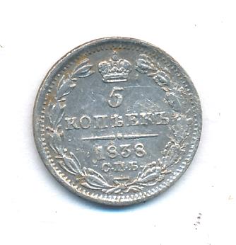 Лицевая сторона — новый гербовый орел с поднятыми крыльями, оборотная —обозначение номинала (5 копеекъ), окруженное венком из лавровой и дубовой ветвей и дата. Проба — 868, нормативный вес — 1,04 грамма.