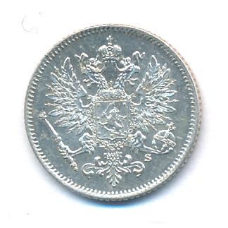 Лицевая сторона — российский двуглавый орел с гербом Великого княжества Финляндского на груди, оборотная — номинал и дата в венке из дубовых листьев. Проба — 750, нормативный вес — 1,27 грамма, гурт рубчатый.