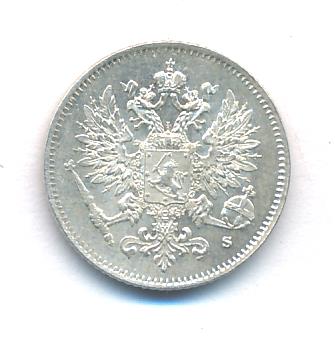 Лицевая сторона — российский двуглавый орел с гербом Великого княжества Финляндского на груди, оборотная — номинал и дата в венке из дубовых листьев. Проба — 750, нормативный вес — 1,27 грамма, гурт рубчатый.