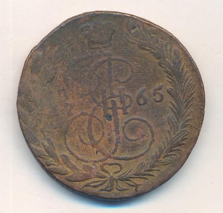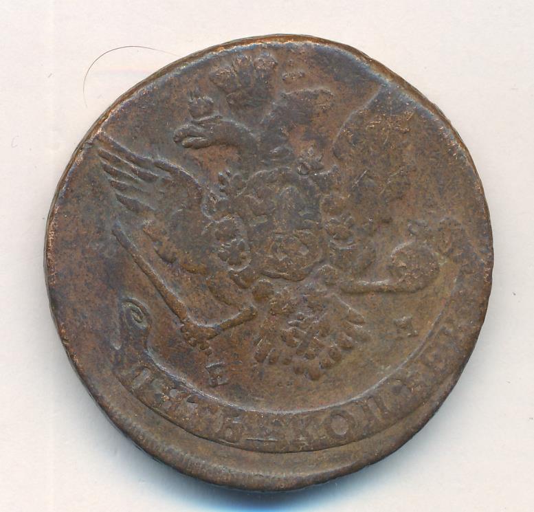 Лицевая сторона — двуглавый орел (выделяют 17 типов орла) и обозначение номинала (пять копеекъ), оборотная — вензель Екатерины II и дата. Нормативный вес — 51,19 грамма, гурт — сетка или шнур.