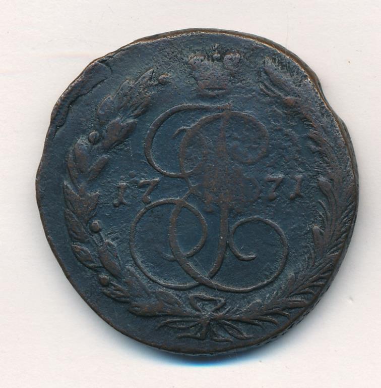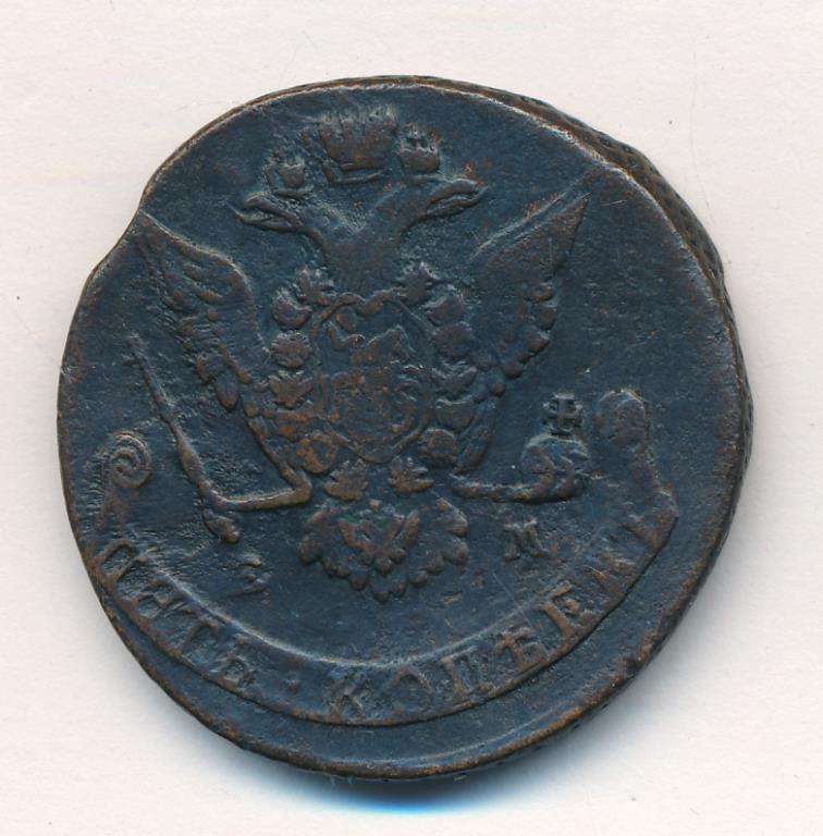 Лицевая сторона — двуглавый орел (выделяют 17 типов орла) и обозначение номинала (пять копеекъ), оборотная — вензель Екатерины II и дата. Нормативный вес — 51,19 грамма, гурт — сетка или шнур.