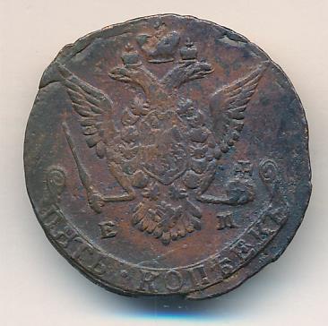 Лицевая сторона — двуглавый орел (выделяют 17 типов орла) и обозначение номинала (пять копеекъ), оборотная — вензель Екатерины II и дата. Нормативный вес — 51,19 грамма, гурт — сетка или шнур.